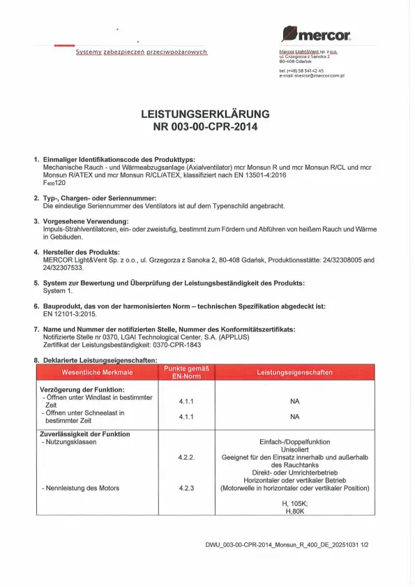 - Feuerwiderstandsklasse F400 und F300