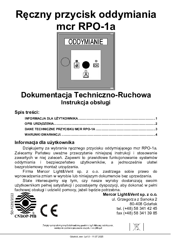 RĘCZNE PRZYCISKI ODDYMIANIA mcr RPO-1 i mcr RPO-1a